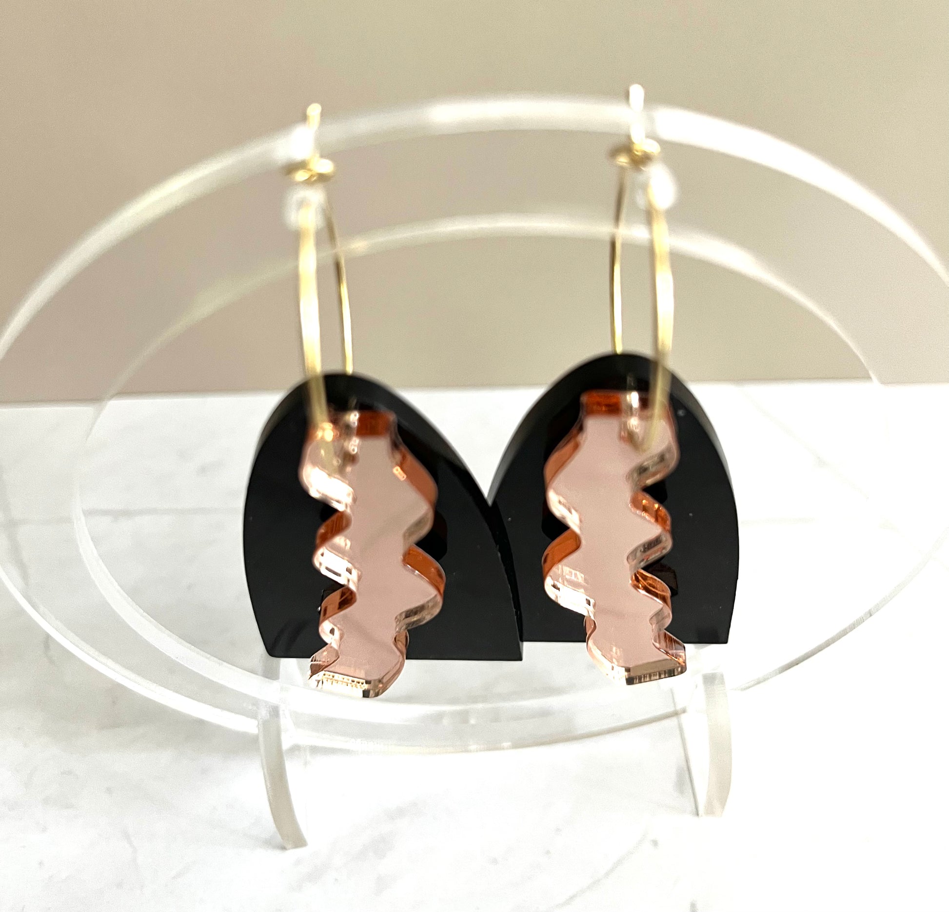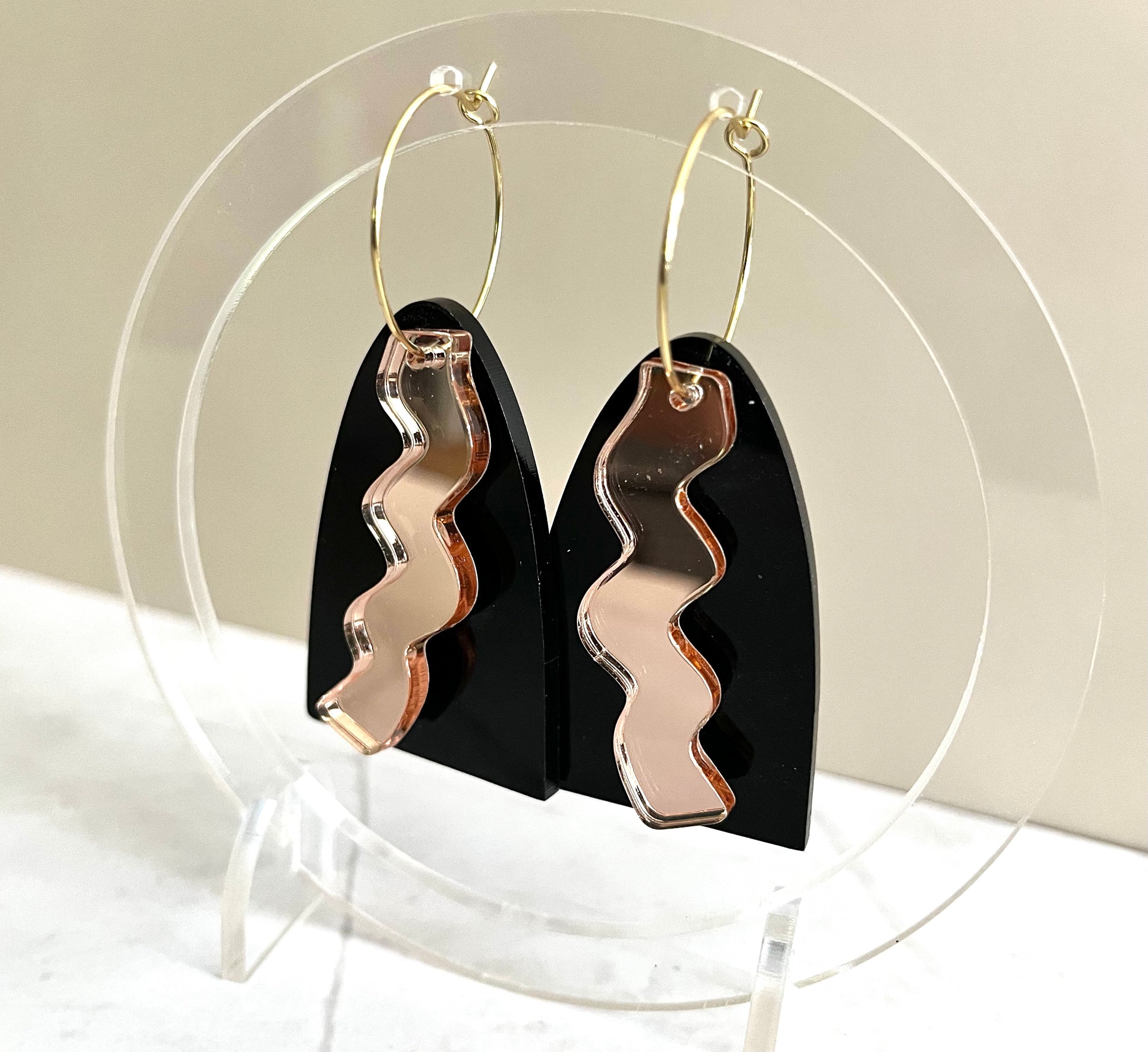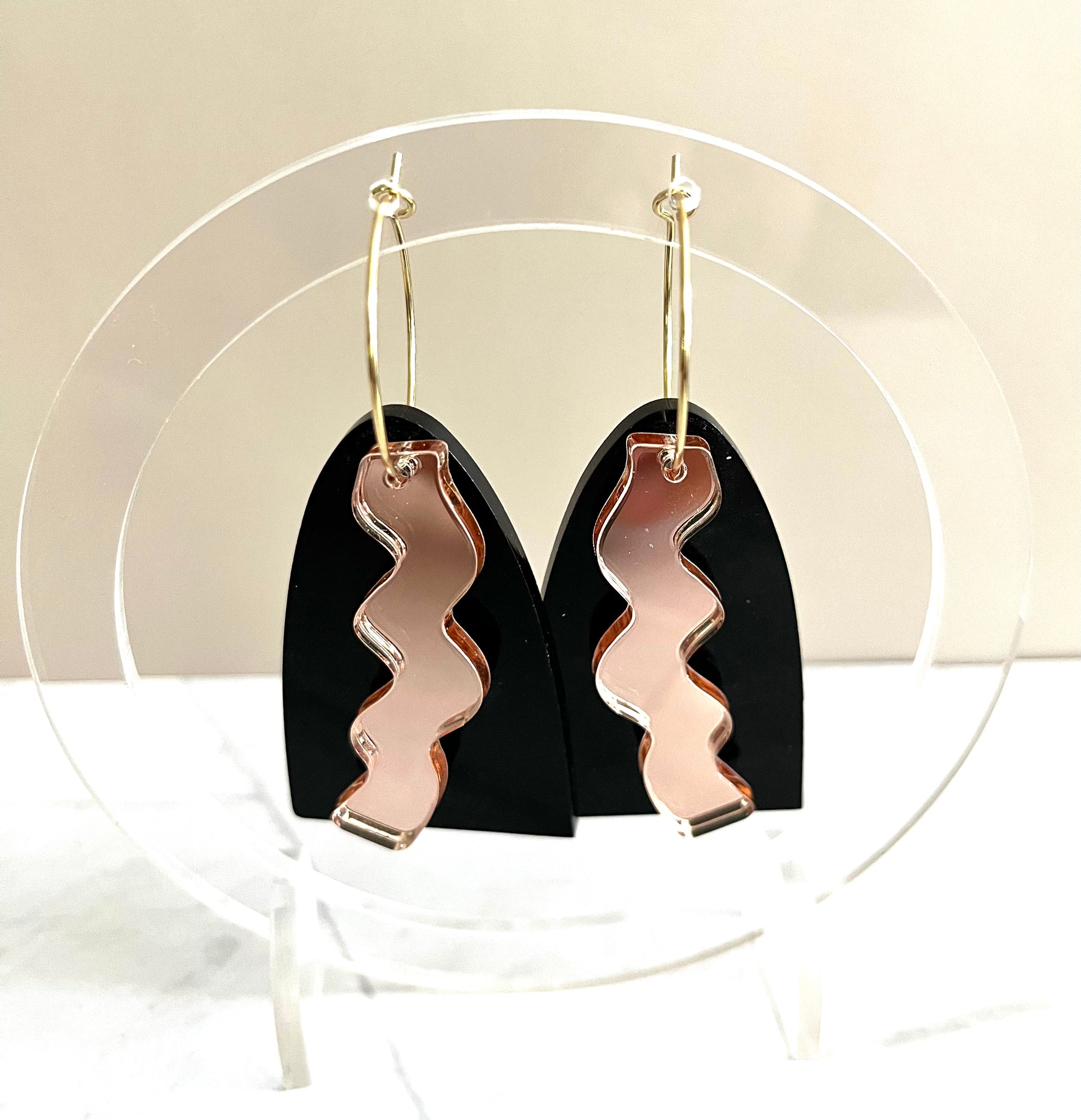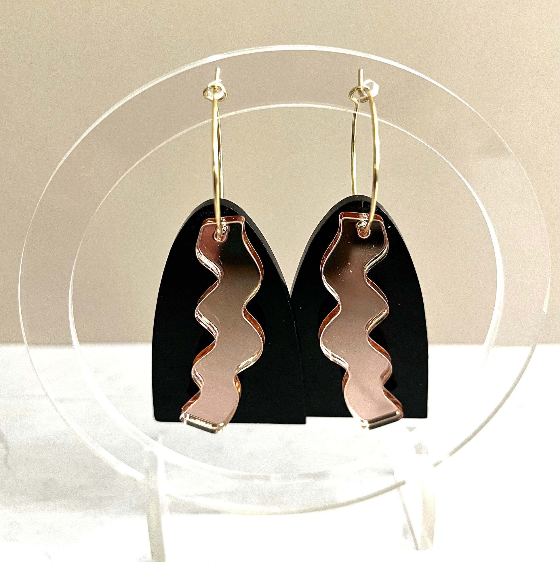 Add a touch of whimsy to your look with these unique statement earrings featuring a sleek, laser-cut arch paired with a fun, mirrored rose gold squiggle. Designed for versatility, each component can be worn together for maximum impact or individually for a more minimal vibe—thanks to the gold-plated hoop ear piece. Lightweight and full of personality, these earrings are perfect for elevating both casual and dressed-up ensembles.