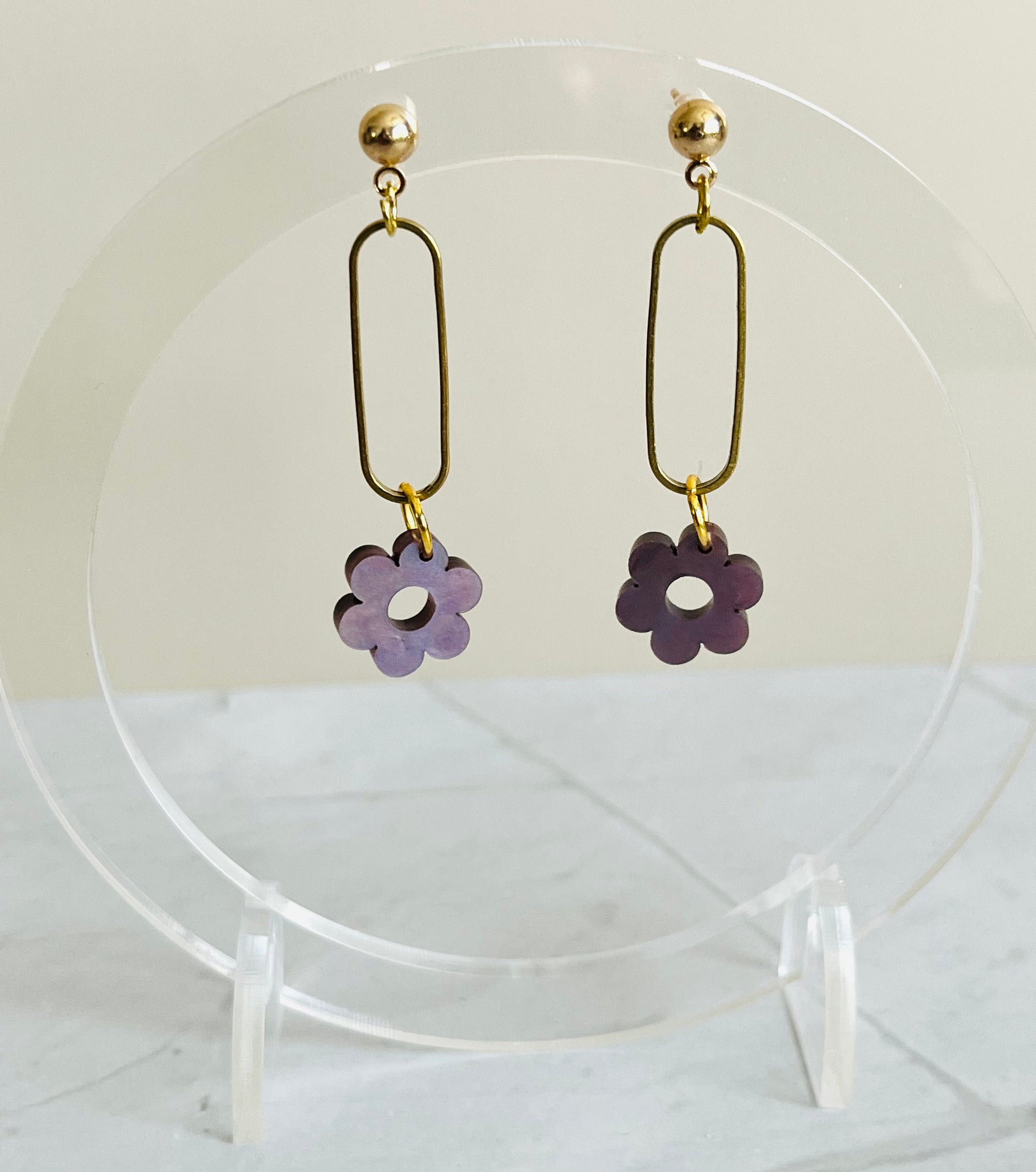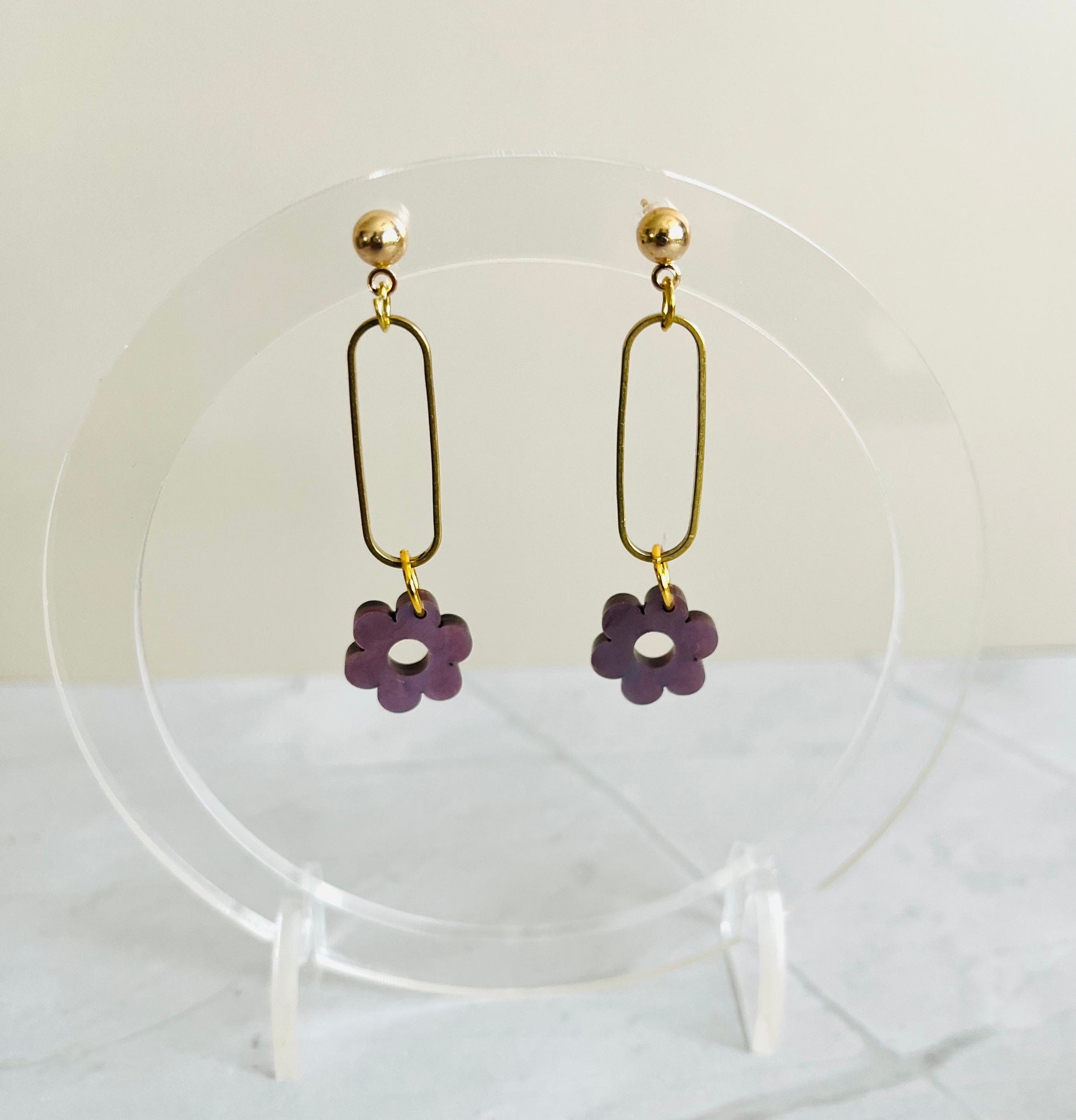 Delicate and charming, these brass hoops feature a small acrylic flower drop for a subtle yet elegant touch. Finished with a gold-plated ear piece for added comfort and shine — perfect for everyday wear or a soft romantic look.