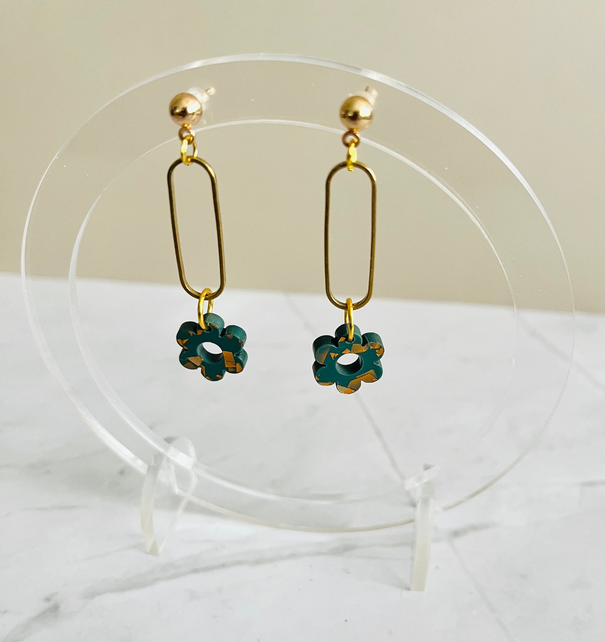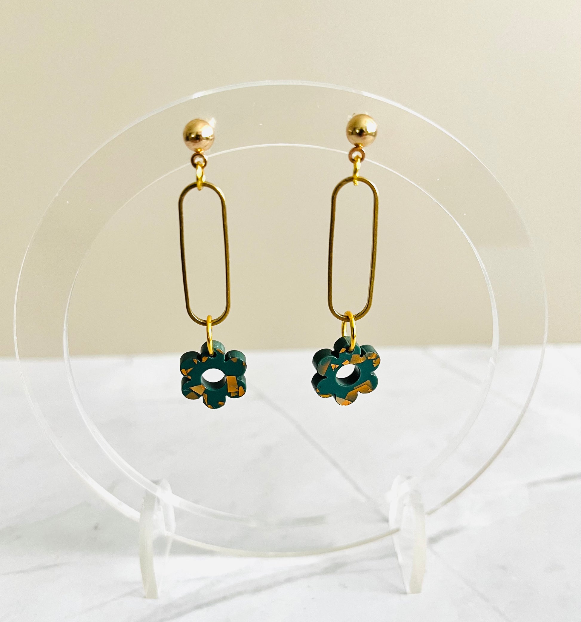 Delicate and charming, these brass hoops feature a small acrylic flower drop for a subtle yet elegant touch. Finished with a gold-plated ear piece for added comfort and shine — perfect for everyday wear or a soft romantic look.
