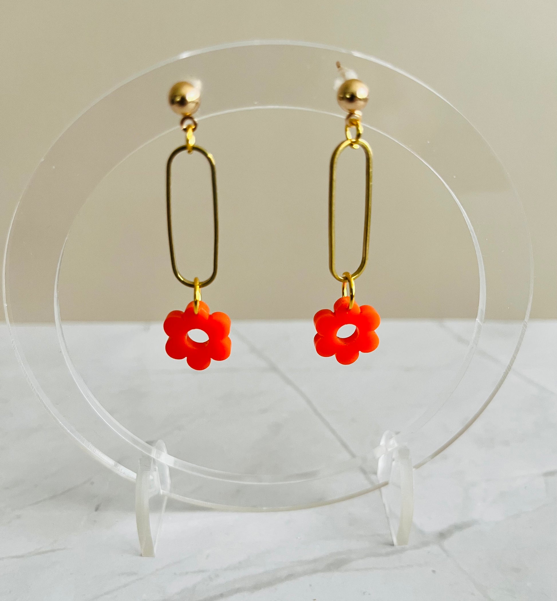 Delicate and charming, these brass hoops feature a small acrylic flower drop for a subtle yet elegant touch. Finished with a gold-plated ear piece for added comfort and shine — perfect for everyday wear or a soft romantic look.