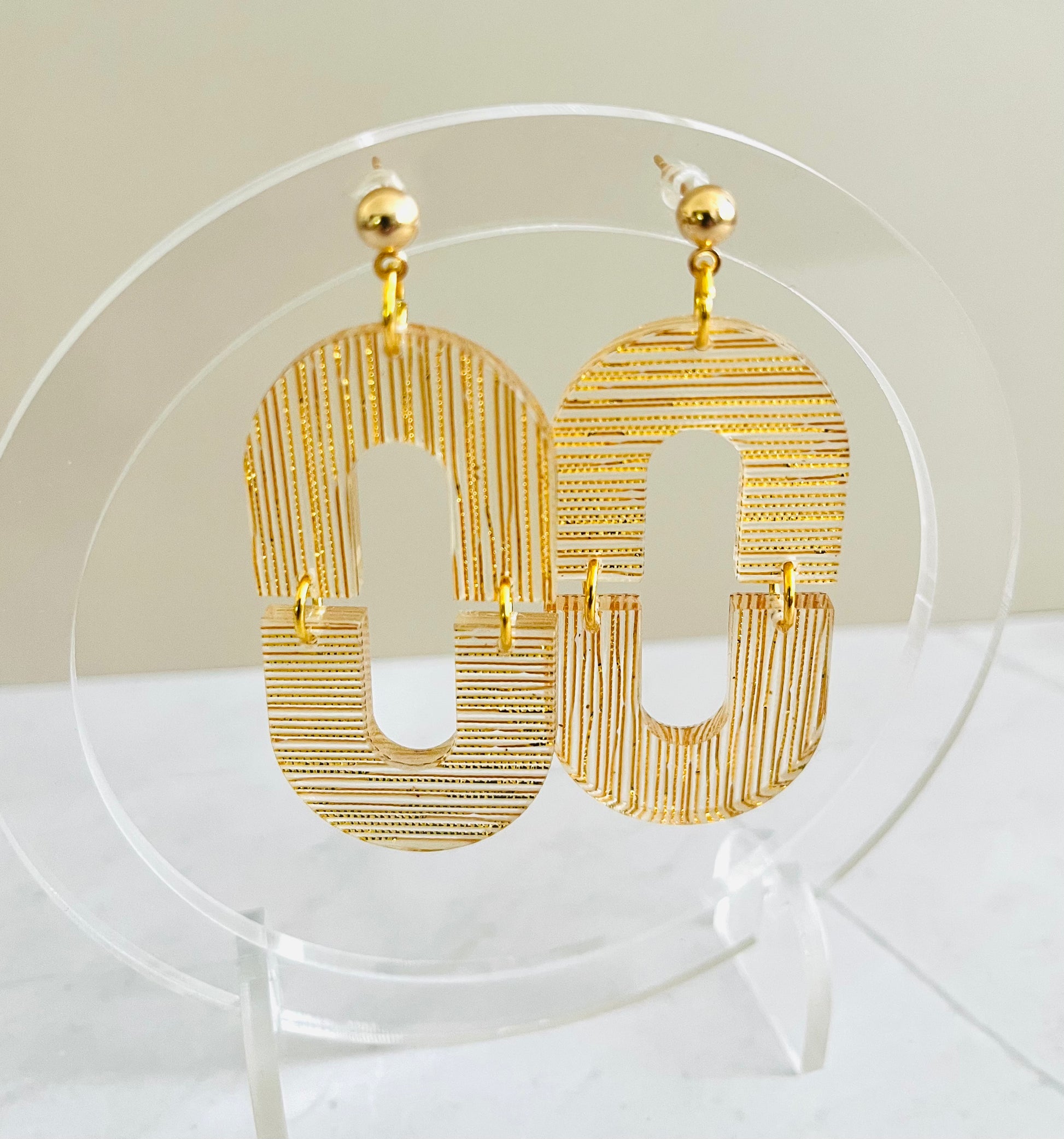 Add a playful pop to your look with these eye-catching earrings! Crafted from laser-cut acrylic in a vibrant gold shimmer color palette, these connected oval hoops feature Lightweight and full of movement, they’re finished with a gold-plated ear post for a hint of shine and all-day comfort.